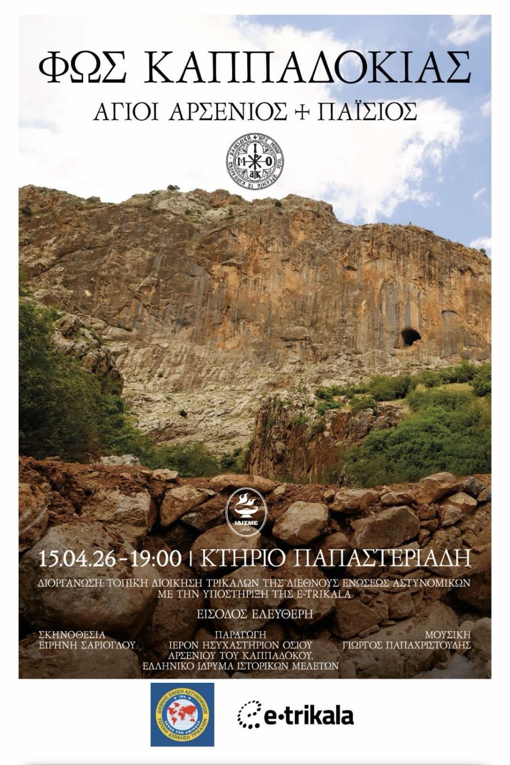 Η Τοπική Διοίκηση Τρικάλων της Διεθνούς Ενώσεως Αστυνομικών σας προσκαλεί την Τετάρτη 15 Απριλίου 2026 και ώρα 19:00, στην αίθουσα Παπαστεριάδη, στην προβολή του ντοκιμαντέρ «Φως Καππαδοκίας: Άγιοι Αρσένιος και Παΐσιος».