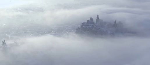 Με εναέρια λήψη, φαίνεται η πόλη καλυμμένη από νέφη, με το Κάστρο το Βυζαντινό και το Ρολόι να ξεχωρίζουν.