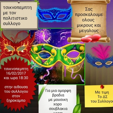 Μετά τις 18:30 το απόγευμα θα ακολουθήσει αποκριάτικο ξεφάντωμα για μικρούς και μεγάλους στην αίθουσα του Πολιτιστικού Συλλόγου Ξηροκάμπου με μουσική, χορό, κρασί. σουβλάκια και άλλα πολλά!!!