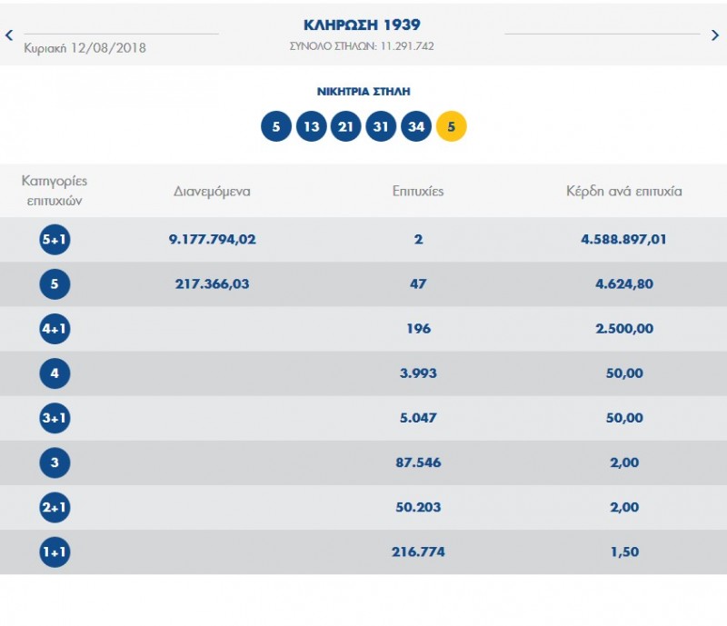 Τζοκερ – Δυο υπερτυχεροί κερδίζουν από 4.588 εκ. ευρώ ΑΘΛΗΤΙΚΑ SPORTS Από admin Δημοσίευση Αυγ 12, 2018 -22:15 0 935 Κοινοποίηση FacebookTwitterΗλεκτρονικό ΤαχυδρομείοViber Δυο υπερτυχερούς ανέδειξε η αποψινή κλήρωση του Τζόκερ. Τα τυχερά νούμερα που έδωσαν σε δυο τυχερούς ( 1η κατηγορία 5+1 ) 4.588.897,01 ευρώ είναι: 5, 13, 21, 31, 34 και τζοκερ το 5. 0 935 Κοινοποίηση