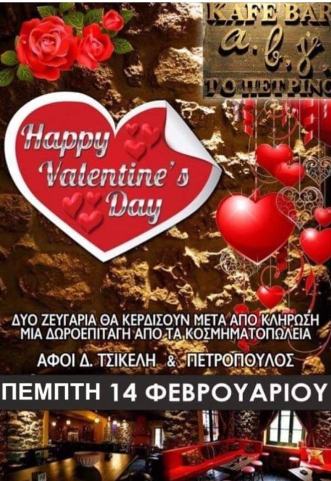 Το καφέ ΑΒΓ ” Το Πετρινο ” στο Καστράκι Καλαμπάκας καλεί όλους τους ερωτευμένους να περάσουν μια όμορφη βραδιά στον φιλόξενο χώρο του και να κερδίσουν δώρα!!!