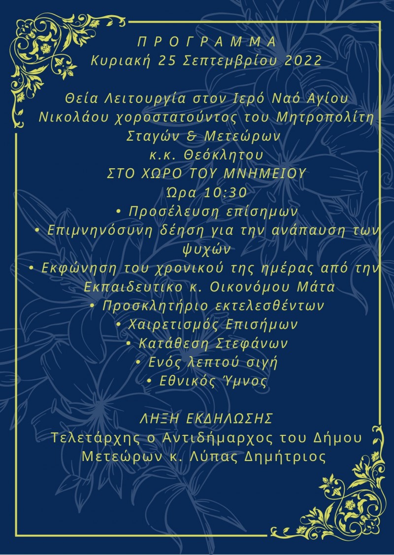 Ο Δήμαρχος Δήμου Μετεώρων, σας προσκαλεί να τιμήσετε με την παρουσία σας τις εκδηλώσεις μνήμης, που θα πραγματοποιηθούν την Κυριακή 25 Σεπτεμβρίου 2022 στην πλατεία Κλαυθμώνος της Βασιλικής για την εκτέλεση των συμπατριωτών μας στη θέση «Προφήτης Ηλίας» Καλαμπάκας στις 24/9/1944 από τα γερμανικά στρατεύματα κατοχής.