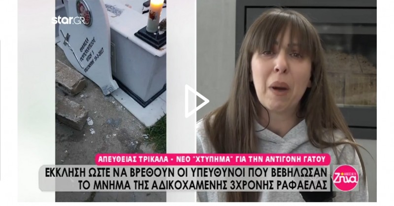 Για δεύτερη φορά η Αντιγόνη Γάτου, η μητέρα της μικρής Ραφαέλας, η οποία είχε συγκλονίσει το Πανελλήνιο με τον αγώνα που έδωσε για να κρατήσει την κόρη της στη ζωή, έζησε την ταφή του παιδιού της και αυτό γιατί κάποιοι ασυνείδητοι βεβήλωσαν τον τάφο της στα Τρίκαλα.