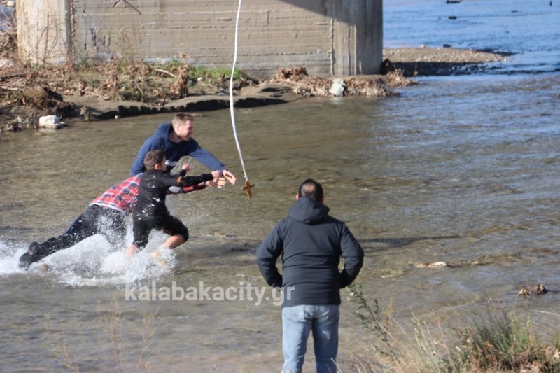 Μετά το Μεγάλο Αγιασμό στον Ιερό Μητροπολιτικό του Αγίου Βησσαρίωνος, οι πιστοί μετέβησαν στη γέφυρα της Διάβας, όπου και πραγματοποιήθηκε ο αγιασμός των Υδάτων, με την κατάδυση του Τιμίου Σταυρού, χοροστατούντος του Μητροπολίτου Σταγών και Μετεώρων κ. Θεοκλήτου. Πλήθος πιστών κατεύθασαν παρά το