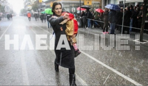 Την ώρα που μικροί και μεγάλοι προσπαθούσαν να προστατευτούν από τη βροχή και το χαλάζι, εκείνη πήρε την 4,5 ετών κόρη της και μια ελληνική σημαία στα χέρια και ξεκίνησε να… κάνει παρέλαση μέσα στην καταιγίδα!
