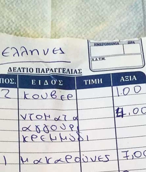 Viral η απόδειξη ταβέρνας που έγραφε την παραγγελία για τους Έλληνες
