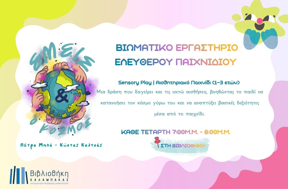 Η Βιβλιοθήκη ανακοινώνει την έναρξη ενός νέου βιωματικού εργαστηρίου με τίτλο «εμείς & ο κόσμος», την Τετάρτη 18 Φεβρουαρίου, στις 19:00, σε συνεργασία με την κα Πέτρα Μηνά και τον κ. Κώστα Καλτσά.