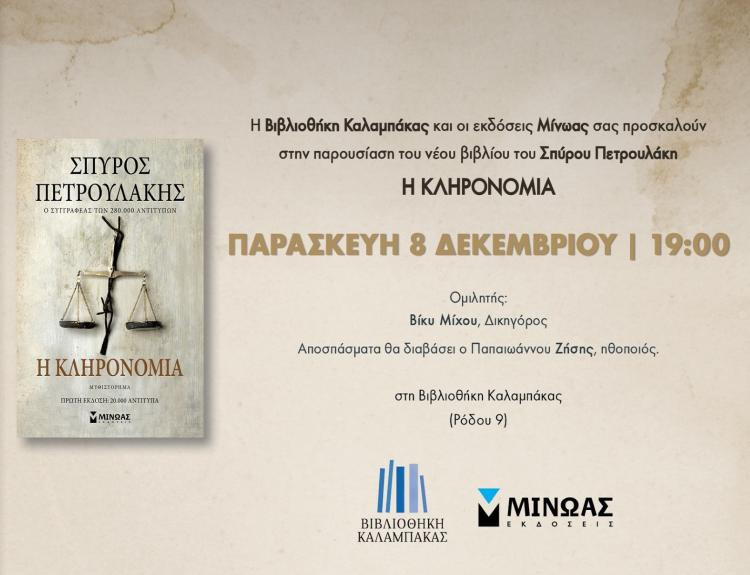 Ο συγγραφέας των best sellers “Σασμός”, “Το ναυάγιο” και “Κατά Ιωάννη”, Σπύρος Πετρουλάκης, θα βρίσκεται στη Βιβλιοθήκη την Παρασκευή 8/12/2023 και ώρα 7:00 μ.μ. για να παρουσιάσει το νέο του βιβλίο με τίτλο “Η Κληρονομιά”. Το βιβλίο θα προλογίσει η κα Βασιλική Μίχου, Δικηγόρος, ενώ ο κ. Ζήσης Παπαϊωάννου, Ηθοποιός και Συγγραφέας, θα διαβάσει αποσπάσματα του έργου. Στο τέλος της παρουσίασης ο συγγραφέας θα συνομιλήσει με το κοινό και θα υπογράψει το βιβλίο του.