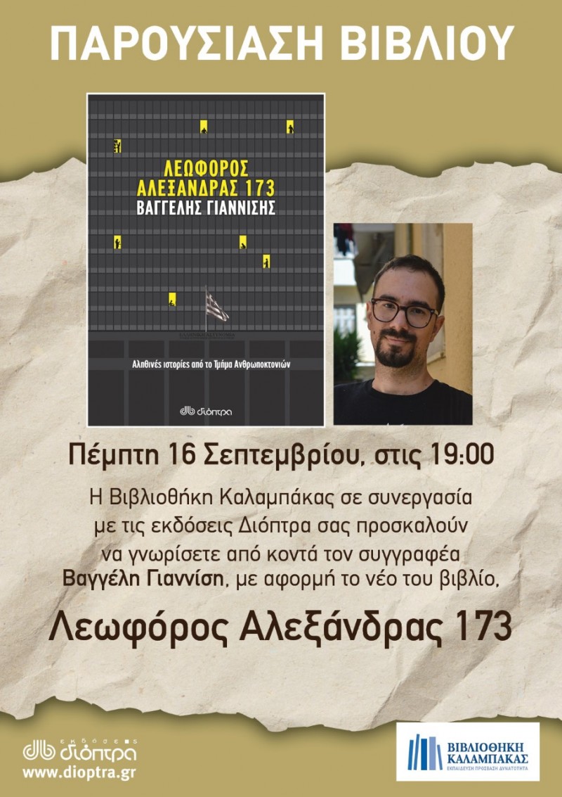 Η Βιβλιοθήκη Καλαμπάκας σε συνεργασία με τις εκδόσεις Διόπτρα σας προσκαλούν να γνωρίσετε από κοντά τον συγγραφέα Βαγγέλη Γιαννίση, με αφορμή το νέο του βιβλίο, Λεωφόρος Αλεξάνδρας 173 την Πέμπτη 16 Σεπτεμβρίου στις 7:00 μ.μ.