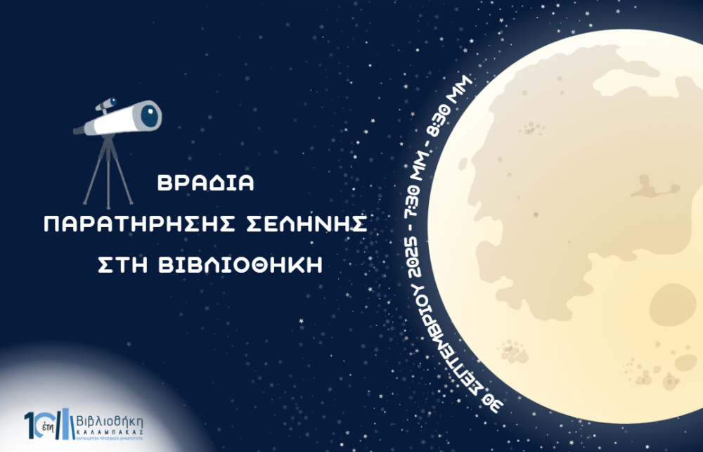 Την Τρίτη 30 Σεπτεμβρίου 2025, στις 7:30 μ.μ., στον αύλειο χώρο της Βιβλιοθήκης, μικροί και μεγάλοι θα έχουμε την ευκαιρία να παρατηρήσουμε τη Σελήνη στο πρώτο τέταρτο, μέσα από το τηλεσκόπιο της Βιβλιοθήκης, απολαμβάνοντας εντυπωσιακές λεπτομέρειες της επιφάνειάς της.