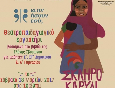 Στο πλαίσιο του Προγράμματος «κι αν ήσουν εσύ;» που υλοποιεί το Πανελλήνιο Δίκτυο για το Θέατρο στην Εκπαίδευση σε συνεργασία με την Ύπατη Αρμοστεία του ΟΗΕ για τους Πρόσφυγες, παρουσιάζεται στην βιβλιοθήκη Καλαμπάκας το Σάββατο 18/3 στις 10:30 το πρωί το εκπαιδευτικό εργαστήριο Σκληρό Καρύδι – για μαθητές, βασισμένο στο ομώνυμο βιβλίο της Ελένης Σβορώνου.