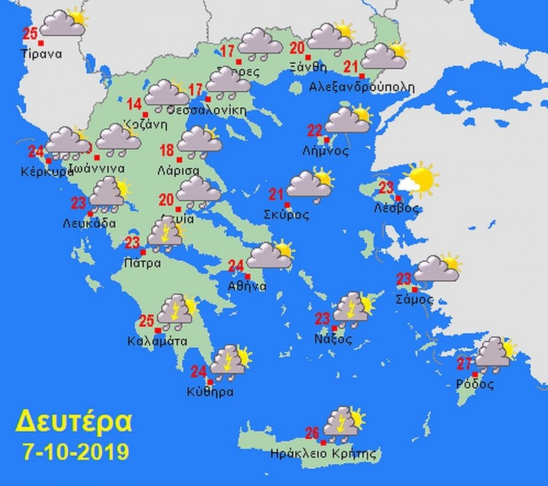 Την Τρίτη βροχές και καταιγίδες τις πρωινές ώρες στην Κεντρική Μακεδονία, την Ανατολική Θεσσαλία, τις Σποράδες, την Εύβοια, τα νησιά του Ανατολικού Αιγαίου και μέχρι το μεσημέρι στα Δωδεκάνησα. Από το απόγευμα τα φαινόμενα θα εξασθενήσουν. Την Τετάρτη βελτιωμένος καιρός στις περισσότερες περιοχές, εξαίρεση τα ανατολικά ηπειρωτικά με συννεφιά και λίγες βροχές. Οι άνεμοι, στο Ιόνιο Νοτιοανατολικοί 5-7, στο Αιγαίο Βορειοανατολικοί 4-6 Μποφόρ. Η θερμοκρασία από την Τετάρτη σε μικρή άνοδο.