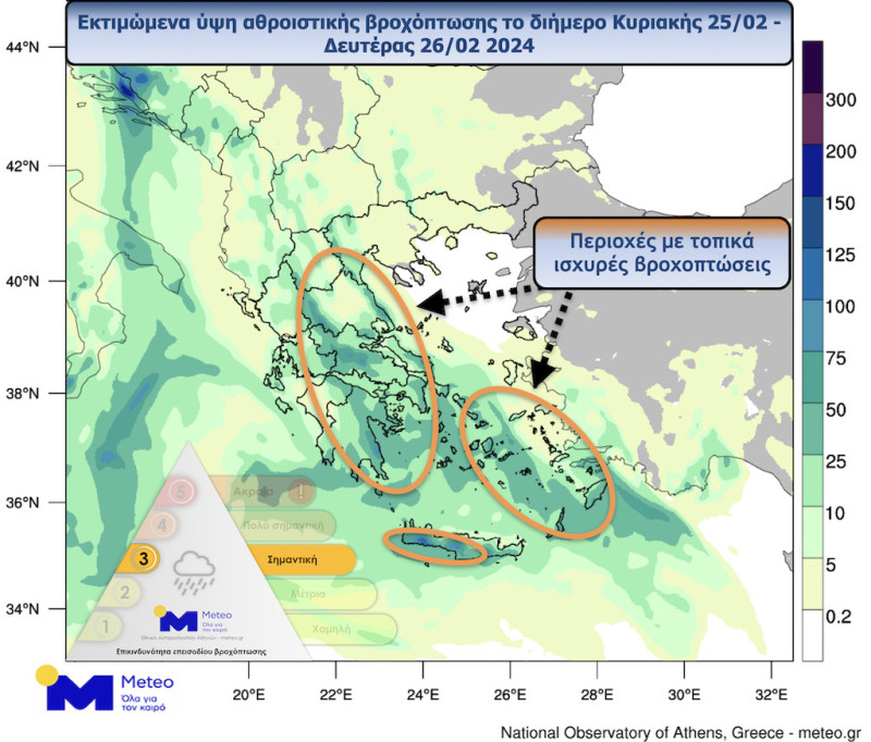 – Οι βροχές και οι καταιγίδες θα είναι κατά τόπους ισχυρές και είναι πιθανό να συνοδεύονται από σημαντικά ύψη βροχής κυρίως σε τμήματα της Ανατολικής και Νότιας Πελοποννήσου, της Ανατολικής Στερεάς (πιθανώς και της Αττικής), της Ανατολικής και Δυτικής Θεσσαλίας, των Κυκλάδων, των νησιών του Ανατολικού Αιγαίου και της Νότιας Κρήτης. Πιθανότητα για σημαντικά ύψη βροχής υπάρχει και για τις δυτικές-νοτιοδυτικές περιοχές της Κεντρικής Μακεδονίας.