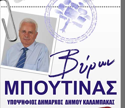 Ένα μήνα πριν τις εκλογές επέλεξε ο νυν Δήμαρχος Καλαμπάκας και δη εκ νέου υποψήφιος για τον Δήμο Καλαμπάκας κ. Βύρωνας Μπουτίνας να παρουσιάσει τις θέσεις και αρχές του συνδυασμού του.