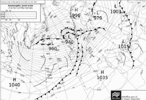 Μετά από ένα διάστημα αρκετά άνομβρο και με πολύ κρύο μπαίνουμε κυρίως από το Σάββατο και μέχρι στις 17-18 Ιανουαρίου σε μια πιο θερμή σχετικά περίοδο .. αλλά με μια εξαίρεση αυτή της Δευτέρας 12 Ιανουαρίου όπου από την αρχή της ημέρας όπως βλέπουμε και στο παρακάτω χάρτη