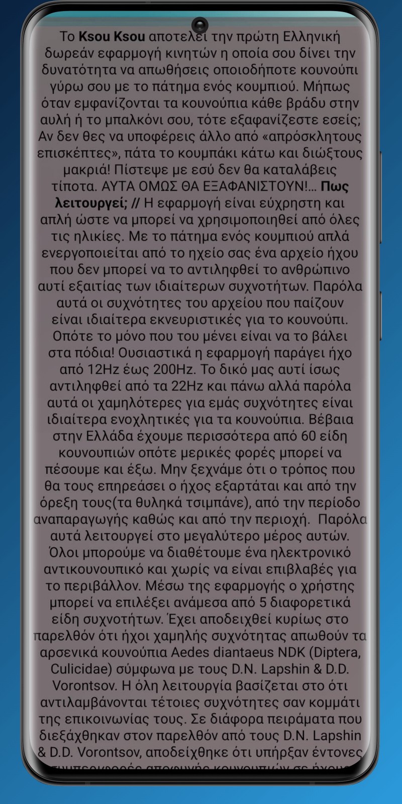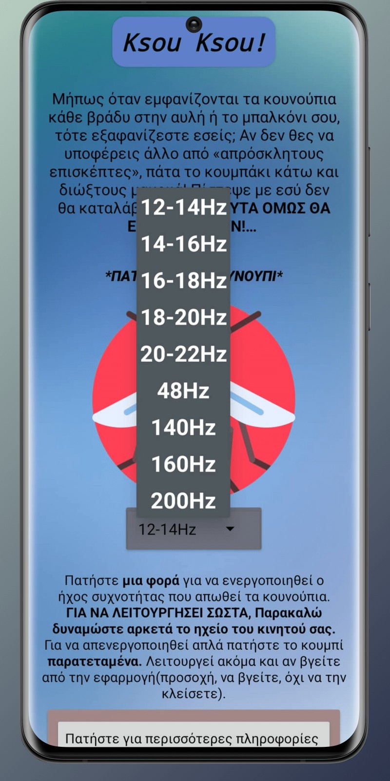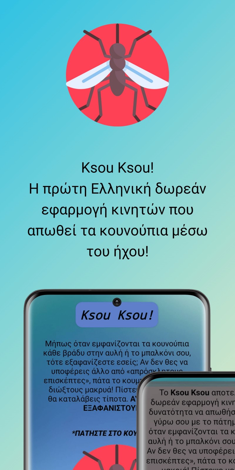 Το Ksou Ksou αποτελεί την πρώτη Ελληνική δωρεάν εφαρμογή κινητών η οποία σου δίνει την δυνατότητα να απωθήσεις οποιοδήποτε κουνούπι γύρω σου με το πάτημα ενός κουμπιού. Μήπως όταν εμφανίζονται τα κουνούπια κάθε βράδυ στην αυλή ή το μπαλκόνι σου, τότε εξαφανίζεστε εσείς; Αν δεν θες να υποφέρεις άλλο από «απρόσκλητους επισκέπτες», πάτα το κουμπάκι κάτω και διώξτους μακριά! Πίστεψε με εσύ δεν θα καταλάβεις τίποτα. ΑΥΤΑ ΟΜΩΣ ΘΑ ΕΞΑΦΑΝΙΣΤΟΥΝ!…