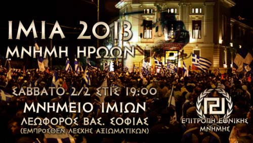 Το Σάββατο 2 Φεβρουαρίου 7 μ.μ στο Μνημείο Ιμίων στη Λεωφόρος Βασ. Σοφίας στην Αθήνα, θα πραγματοποιηθεί η ετήσια συγκέντρωση – πορεία Μνήμης και Αντίστασης για τα τραγικά γεγονότα των Ιμίων του ’96 και τον ηρωικό θάνατο τριών Ελλήνων αξιωματικών του Πολεμικού Ναυτικού.