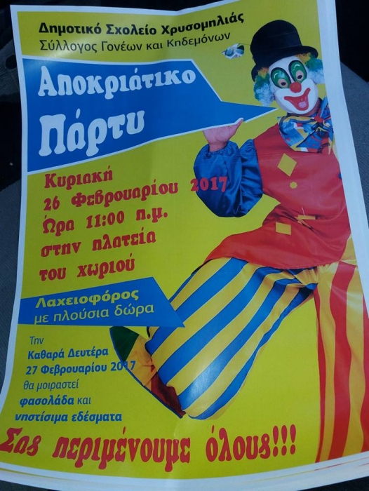 Ο Σύλλογος Γονέων και Κηδεμόνων του Δημοτικού Σχολείου Χρυσομηλιάς, για την Κυριακή έχει ετοιμάσει αποκριάτικο πάρτυ για όλα τα παιδιά στην πλατεία του χωριού το οποίο ξεκινά στις 11:00 το πρωί, με πλούσια λαχειοφόρο ενώ θα μοιραστούν σουβλάκια και αναψυκτικά! Επίσης τα παιδιά θα παίξουν με διάφορα παιχνίδια