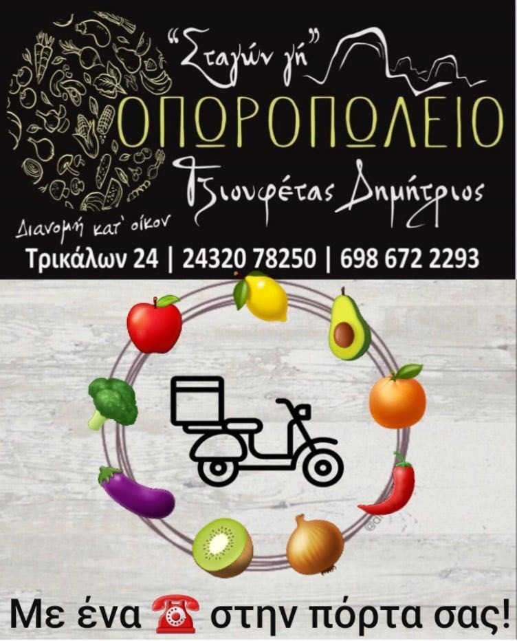 Το Οπωροπωλείο “Σταγών Γη” του Δημήτρη Τζιουφέτα στην Καλαμπάκα ανακοινώνει πως από αύριο στα πλαίσια λήψης μέτρων κατά του κορονοϊού και στην περιορισμένη μετακίνηση των πολιτών, θα πραγματοποιεί υπηρεσία delivery από τις 09:00 το πρωί έως τις 14:00 το μεσημέρι.ε