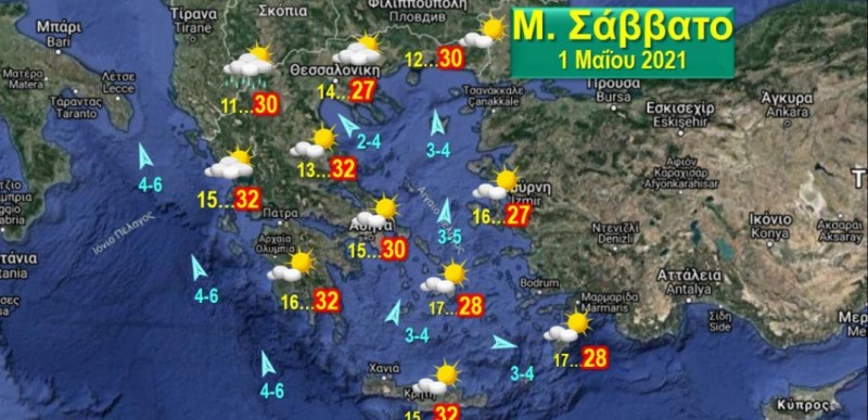 Μεγάλο Σάββατο, 1-5-2021 – Καλός και αρκετά ζεστός καιρός με ηλιοφάνεια, πρόσκαιρη συννεφιά και αυξημένη αφρικανική σκόνη. Πιθανές λίγες τοπικές βροχές στα ορεινά της Ηπείρου και της δυτικής Μακεδονίας.