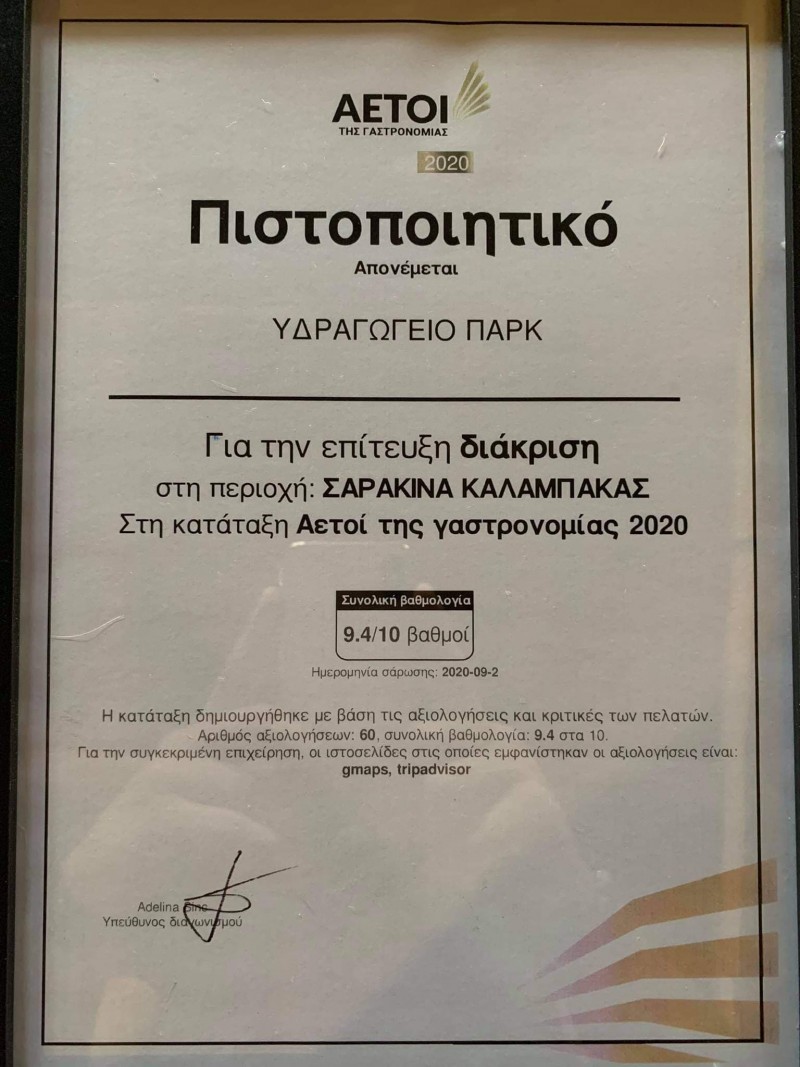 Συγκεκριμένα το Υδραγωγείο Παρκ έλαβε συνολική βαθμολογία 9,4 στους 10 βαθμούς στην κατάταξη Αετοί της Γαστρονομίας από τις θετικές αξιολογήσεις και κριτικές πελατών σε gmaps και tripadvisor.
