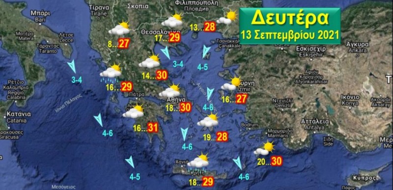 Δευτέρα 13-9-2021 – Καιρός: Σχεδόν αίθριος στις περισσότερες περιοχές, εξαίρεση το μεσημέρι-απόγευμα παροδική συννεφιά και λίγες βροχές στα ορεινά της Ηπείρου, της Μακεδονίας και πιθανόν της Κρήτης.