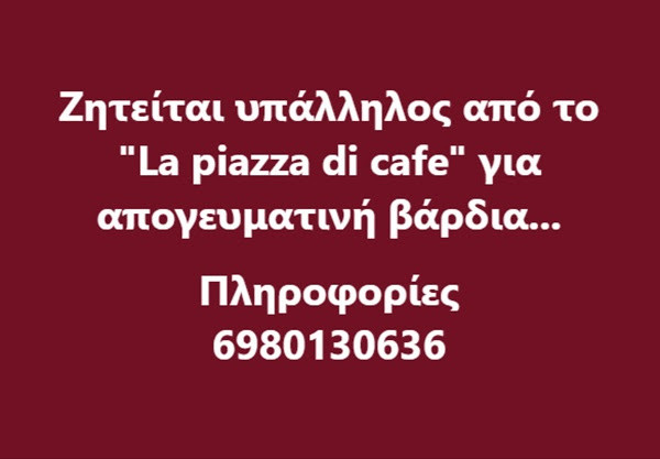 Ζητείται υπάλληλος από το «La Piazza di Cafe» στην πλατεία Δημουλά (πρώην ζαχαροπλαστείο Βαβίτσας).